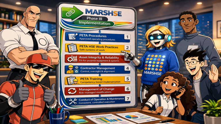The Implementation phase executes the Management System by applying PETA procedures, managing contractors, ensuring asset integrity, training personnel, controlling changes, and maintaining safe, reliable operations aligned with HSE requirements.