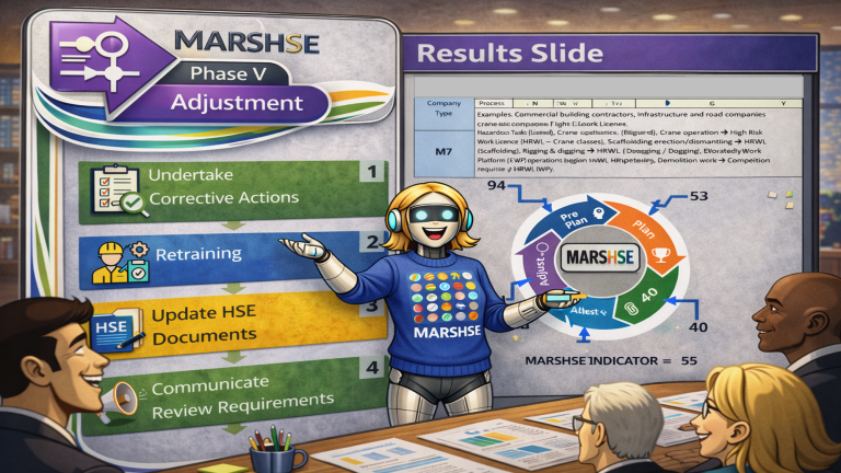 The Adjustment phase improves the Management System by applying corrective actions, retraining staff, updating HSE documents, and embedding lessons learned to close gaps and sustain continuous improvement.